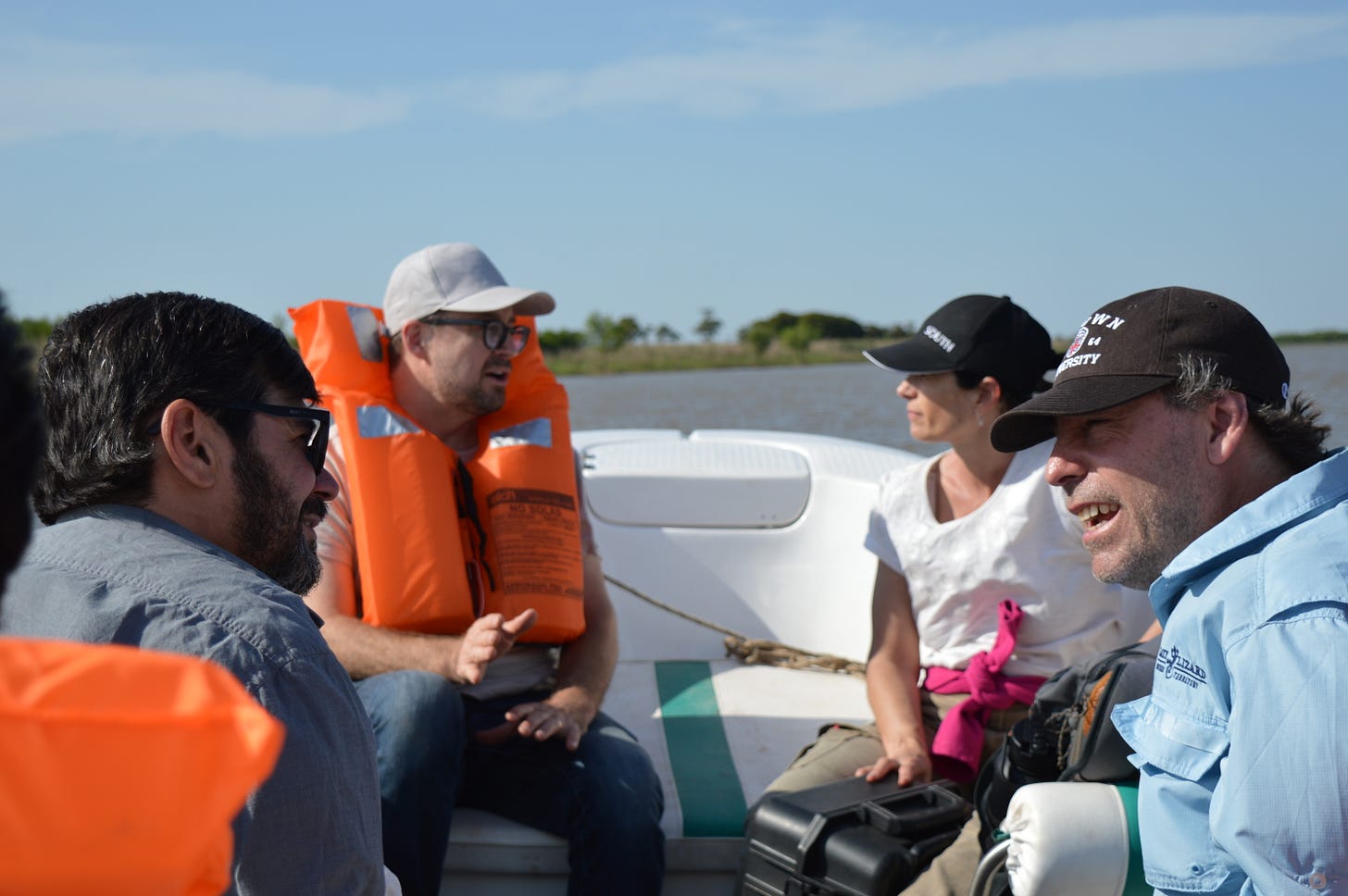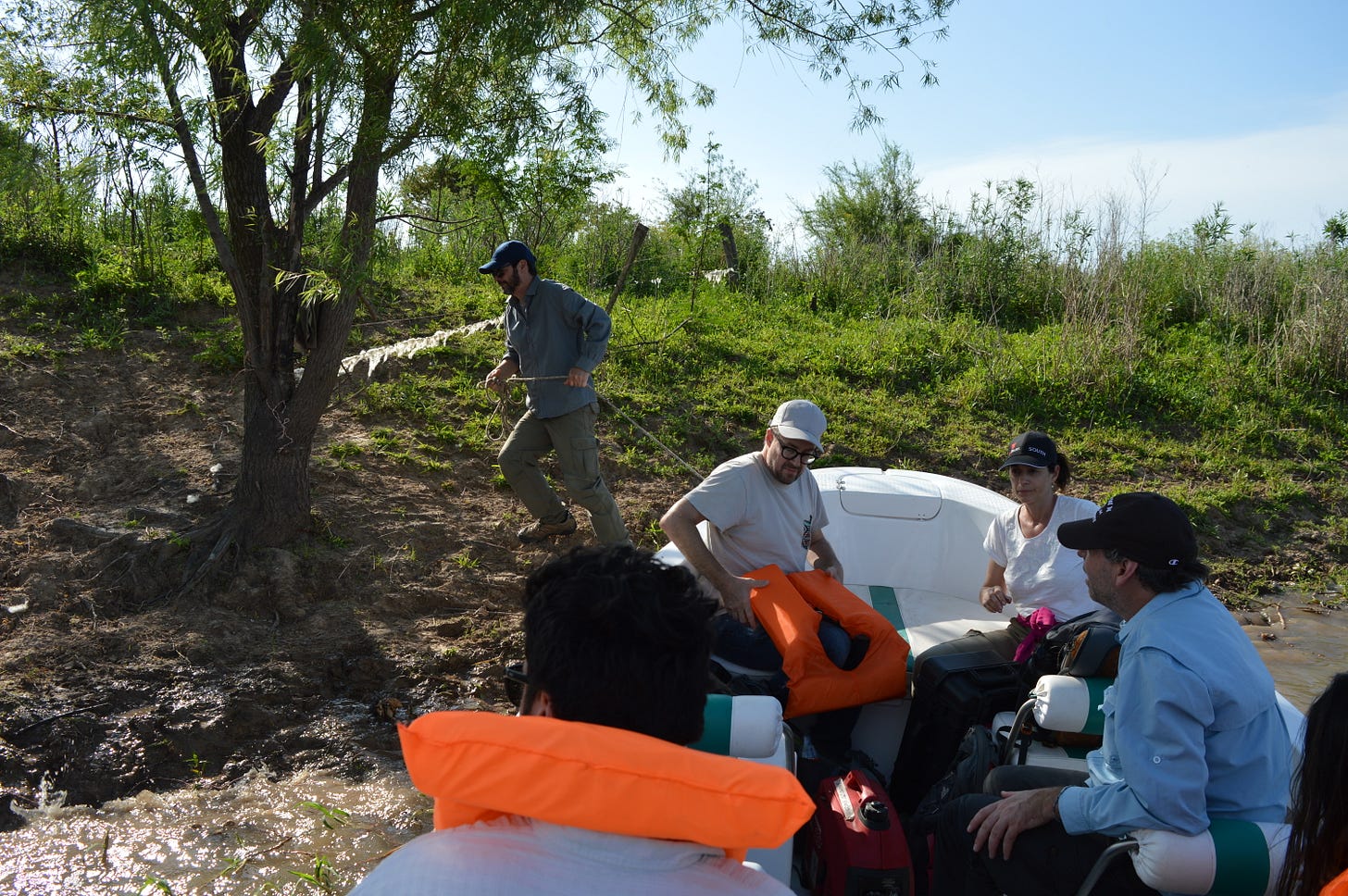 El primero en bajar de la lancha y atar un cabo al tronco de un árbol costero es Rodrigo Angrizani: brasilero, viajó hace 20 años a estudiar en La Plata y se sumó al equipo del profesor Mariano Bonomo. Es doctor en Ciencias Naturales con especialización en arqueología. Se quedó en Argentina y trabaja como investigador del Conicet (en el Centro de Investigación Científica y de Transferencia Tecnológica a la Producción de Diamante, Entre Ríos).