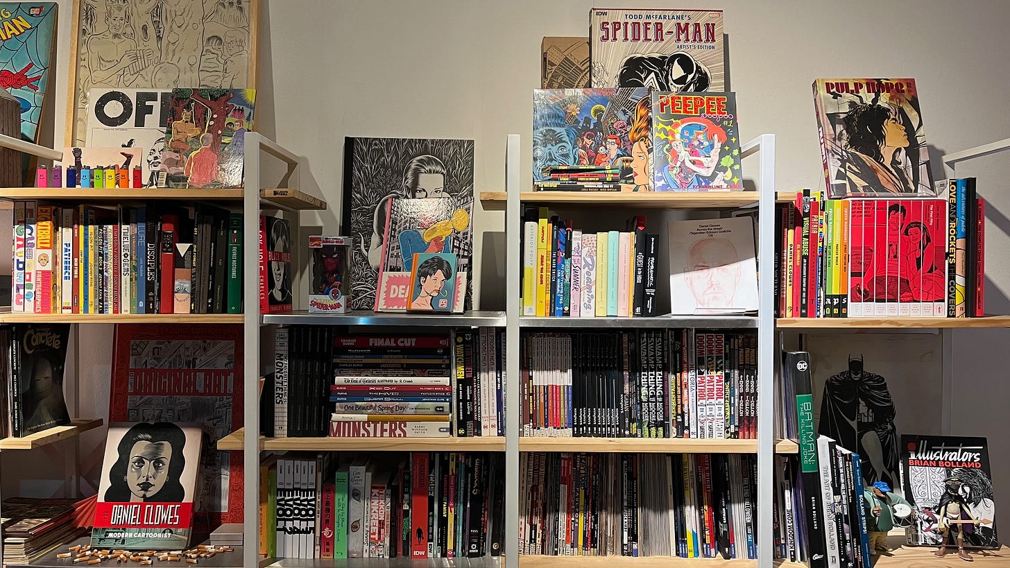 1. “Si reservás turno y no venís, quedás vetado para siempre”, dice Julio César Battistelli, parado detrás de la cortina de PVC semitransparente que separa su estudio de diseño e ilustración del espacio de Librería Pública, su nuevo proyecto. Estamos en una oficina en una casa de alto en la cuadra de Santa Fe que está entre Balcarce y Oroño, a la que cualquiera puede ir a encontrarse con la colección de historietas, cómics, novelas gráficas, fanzines y libros de diseño que Julio -conocido bajo el seudónimo Yaia en el mundo virtual- cargó en su cerebro a lo largo de su vida. “Todo lo que sé de diseño e ilustración lo saqué de esto”, explica, y señala la pared llena de estantes repletos de libros, obsesivamente ordenados.